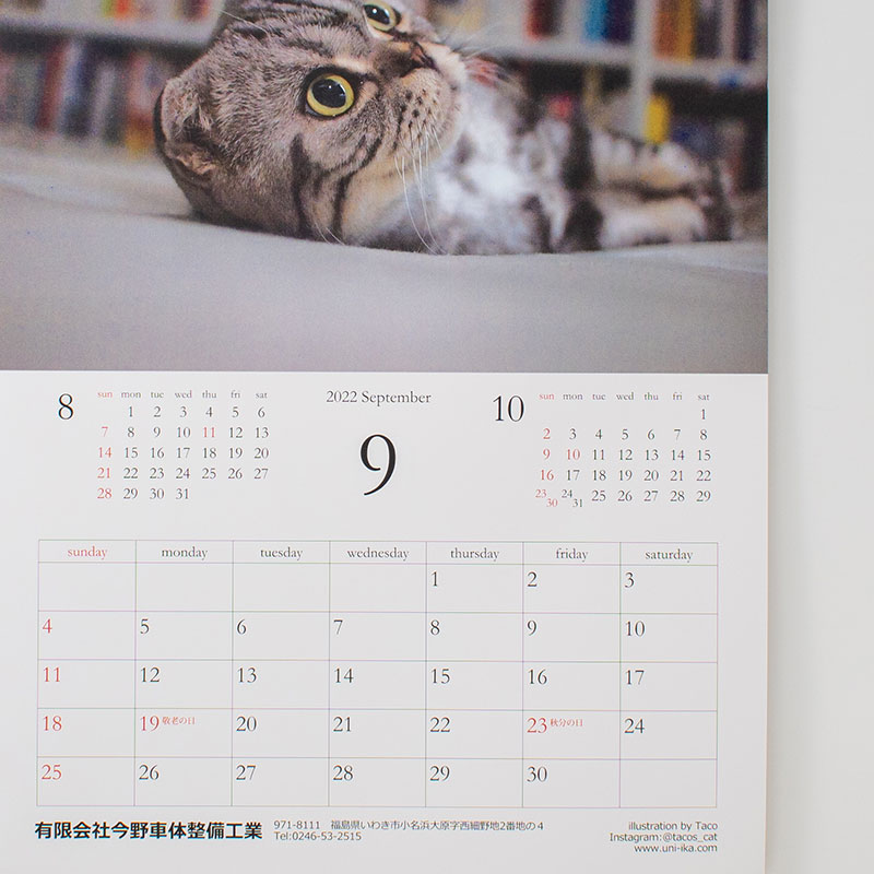 飼い猫の写真を使ってカレンダーを作っているのです。他にもイラストを使ったカレンダーも作成しており、毎年2種類作成しています。どちらのカレンダーもすぐになくなってしまうようで大変嬉しい限りです。