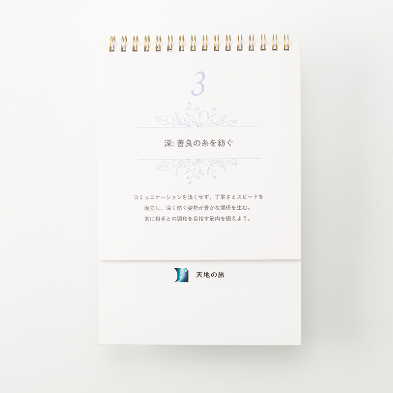 また、私たちの会社で大切にしている考え方や教訓を知っていただき、皆さんの生活の糧にしていただけたらとの思いでオリジナル日めくりカレンダーの形式で作成いたしました。