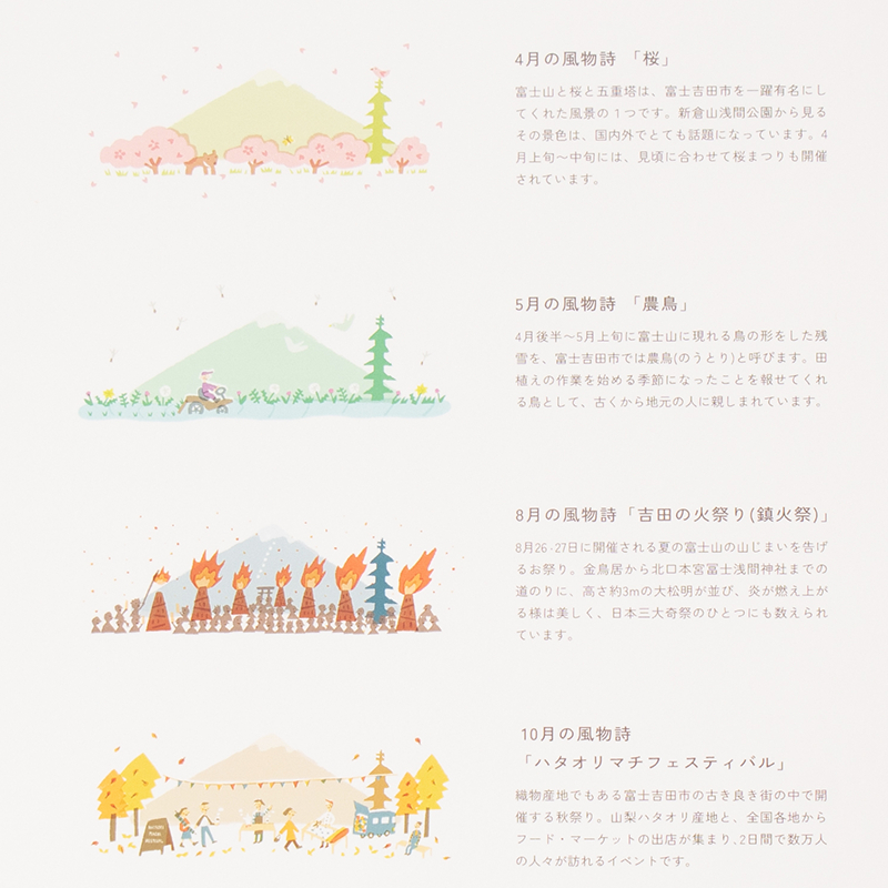 季節で変化するまちの風景を、オリジナルカレンダーをめくりながら楽しんでもらいたいという思いを込めて、制作を行いました。